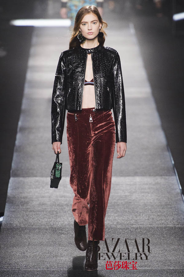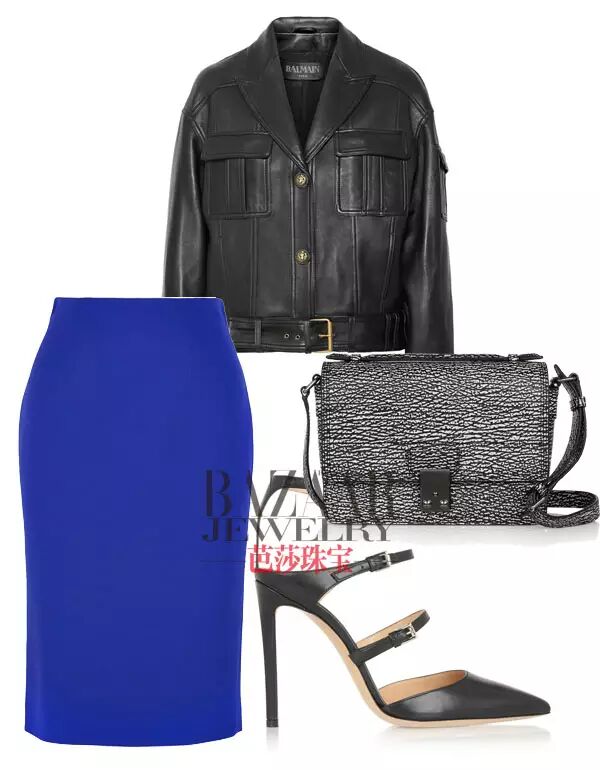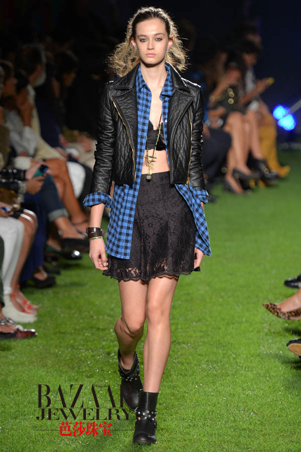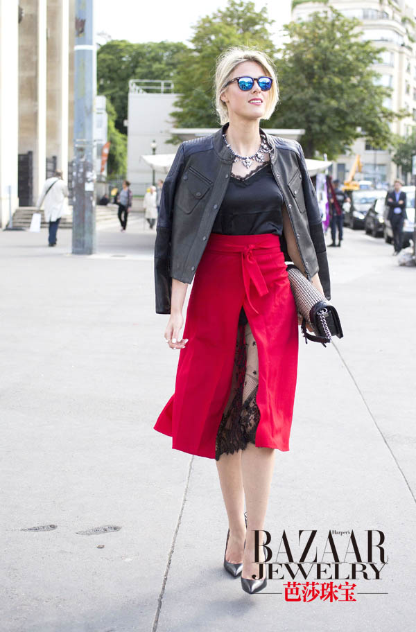 如果你留心發現,第一張裡面模特佩戴了大耳環,第二張裡面有大piece項鍊。SO, boyfriend款皮衣搭配一定就要大piece!紋理繁複的大件水晶項鍊,能夠增添優雅,也平衡了硬朗皮夾克與柔美蕾絲裙間的反差。