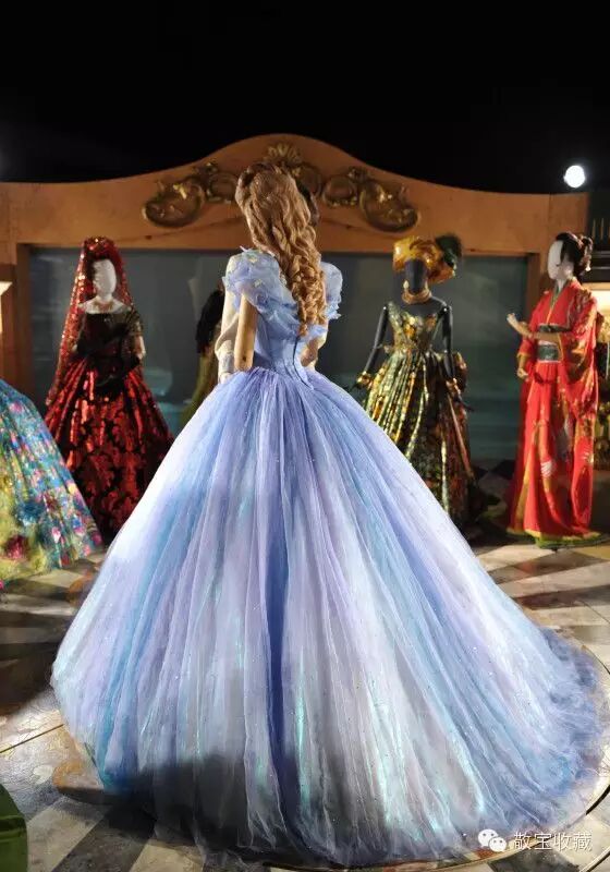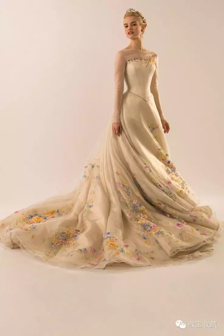 灰姑娘的長袖婚紗是歐根紗材質的,但不是純白的,帶點米色。用了16 個裁縫,花了550 小時才做完,上面的花都是手繪的。