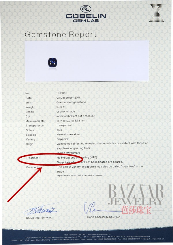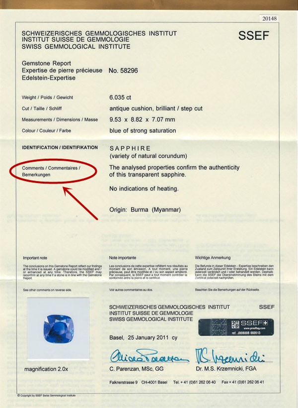 所以如果具有 SSEF 的證書,那麼你的珠寶真假是一定可以保證的,至於是否經過處理以及處理方式,會在 Comments 這一項中進行詳細描述。