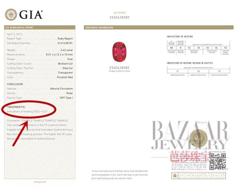 鑽石鑑定、分級最出名的GIA同樣也有彩色寶石證書,其中Treatment(s)一項是對寶石處理方式的描述。