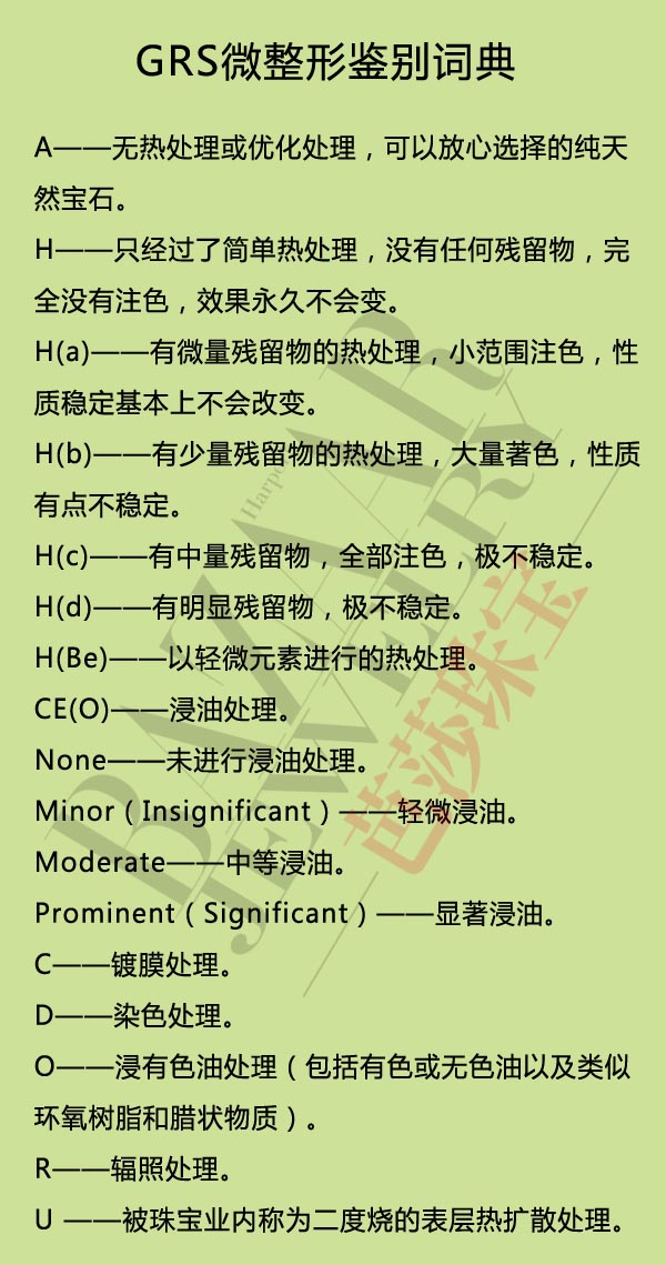 但 GRS 對於處理方式及級別的介紹選擇了簡單的字母來表示,這可不是誰都能看懂的,需要經驗還有技巧!芭珠姐附上鑑別詞典,小伙伴快對應起來~